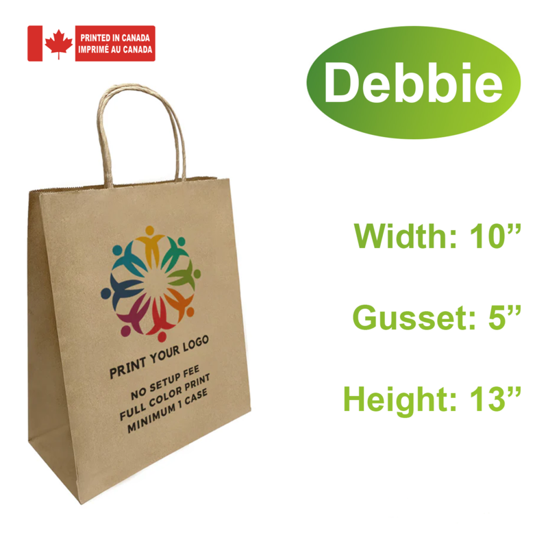 250pcs, Custom Printed Kraft Paper Bags 10x5x13 Inches, Twist Handles, Flat Bottom – Made in Canada
